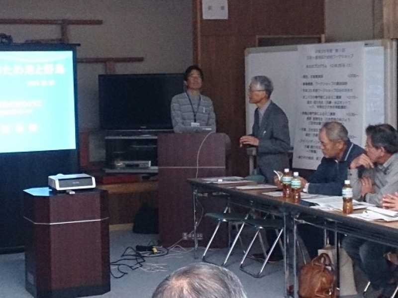 兵庫・水辺ネットワークの碓井氏より、江井ヶ島ため池のオニバスについて、日本野鳥の会の奥野さんより、江井ヶ島地区で観察される野鳥について、野鳥観察会の進行例も交えながら、お話していだきました。